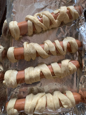 Start with one strip of dough and wrap it around the hot dog like a mummy bandage. Continue, pressing the end of the last strip together with the start of a new strip and leave a small space between the "body" and the top of the "head" so you can dot two eyes there. Try to get the joints on the bottom, then place joined side down on a baking sheet lined with parchment (obviously I didn't have parchment so used tin foil) and sprayed with cooking spray. Repeat with all of the hot dogs.